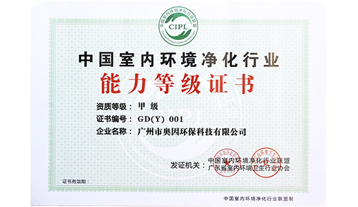 奧因先后獲評廣東省室內(nèi)環(huán)境污染專業(yè)治理A級資質(zhì)、國家室內(nèi)環(huán)境治理甲級資質(zhì)